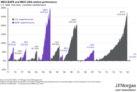U.S. stocks have dominated global equity markets for over a decade. They have consistently outperformed their foreign counterparts since the end of the financial crisis and now represent about 60% of global stock market capitalization. However, there are signs that the tide has begun to turn. J.P. Morgan recently declared a regime change in favor of international stocks, reflecting a peak in U.S. cumulative outperformance not reached again in the subsequent 12 months. The accompanying chart shows MSCI EAFE (Europe, Australasia, and Far East) beginning to outperform the U.S.