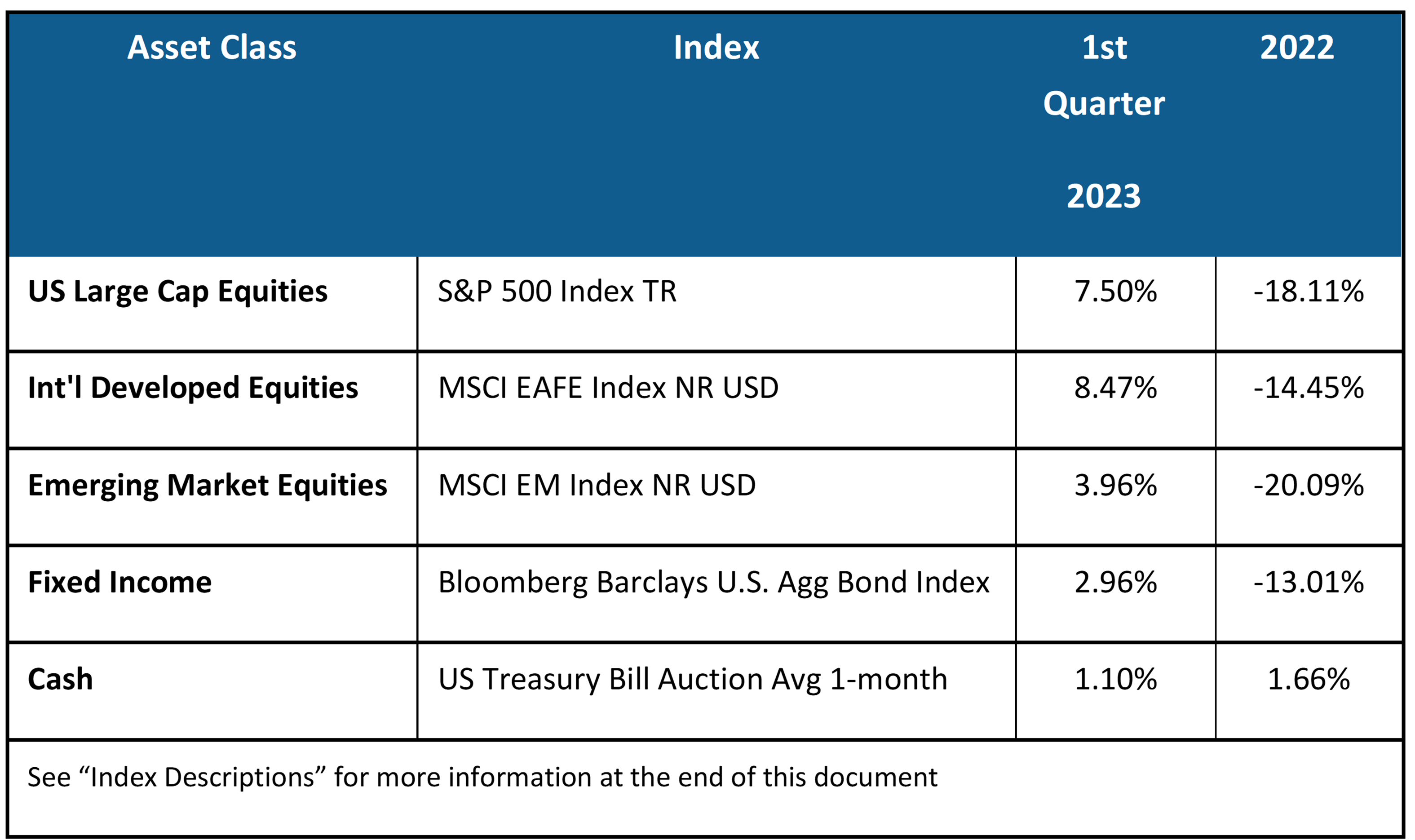 MARKET RETURNS: Stock and bond markets both rallied to start the year in a welcome departure from 2022’s declines. Last year’s relative performance trends continued across global equity regions. International developed markets outperformed thanks to a combination of U.S. dollar weakness, a mild winter, and different composition within sectors. U.S. stocks were close behind, led by large growth companies that took steps to reposition their businesses for a higher interest rate environment. Emerging markets underperformed as geopolitical uncertainty lingered, but still posted healthy gains. Style trends within stock markets displayed a dramatic reversal as growth and quality stocks outperformed their value and low volatility peers and beat-up technology stocks led the rally while 2022’s top sector energy finished the quarter negative. Fixed income generated strong returns as intermediate-term interest rates fell, with foreign bonds also experiencing currency appreciation. The impact of higher short-term interest rates was apparent in cash approaching two-thirds of its full-year 2022 return after a single quarter.