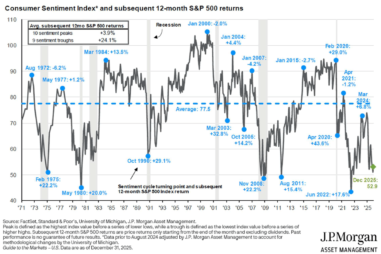 We see two reasons for optimism in these mixed signals. Actions speak louder than words (or sentiment) and most indications suggest consumers continue to spend despite economic anxiety. Sentiment surveys also tend to serve as a contrarian indicator for investors, with stronger stock market returns following depressed readings.